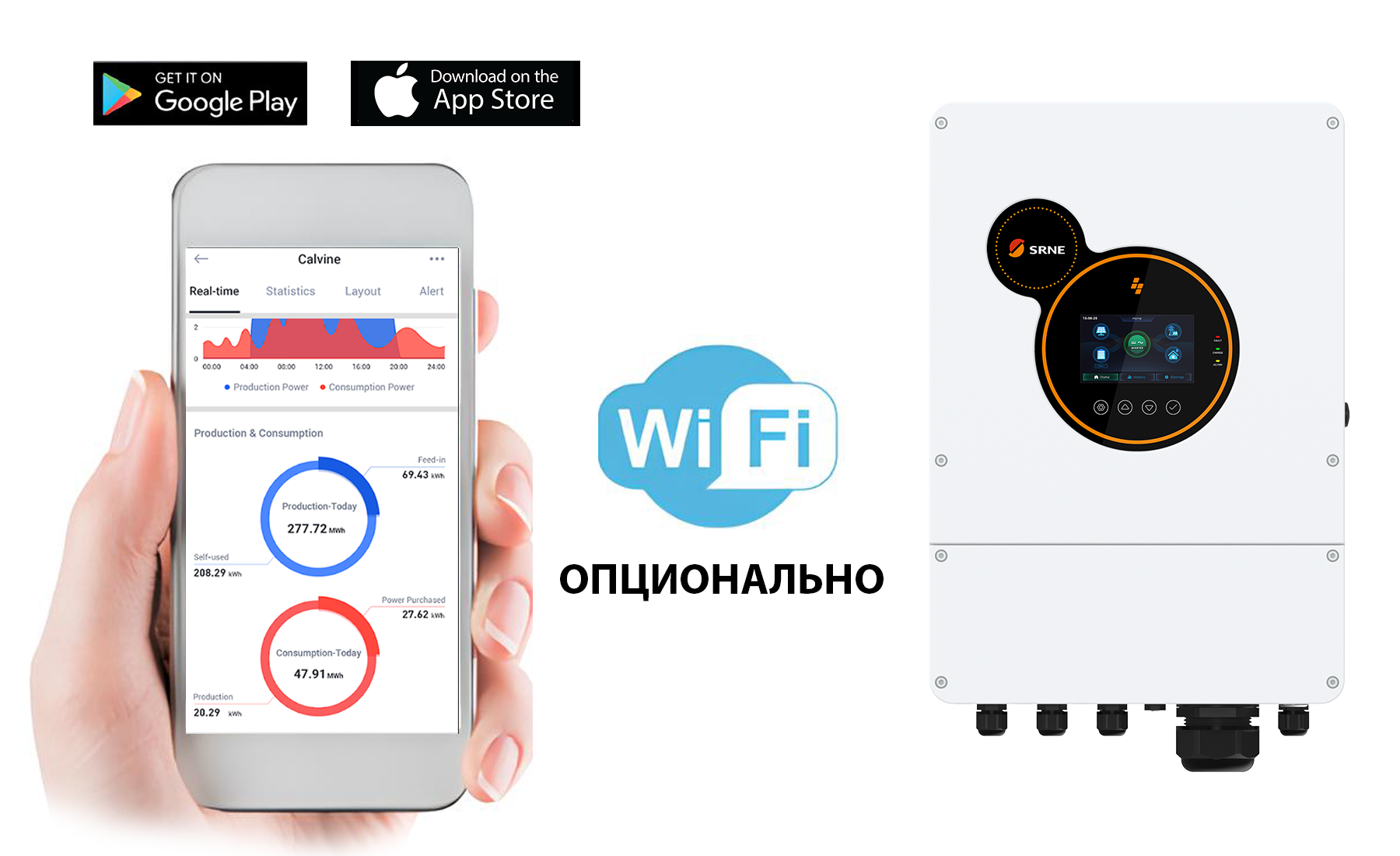 Инвертор SRNE 6048S поддерживает возможность удалённого мониторинга по Wi-Fi. Для этого требуется установка специального Wi-Fi модуль для инверторов SRNE, который приобретается за отдельную доплату.